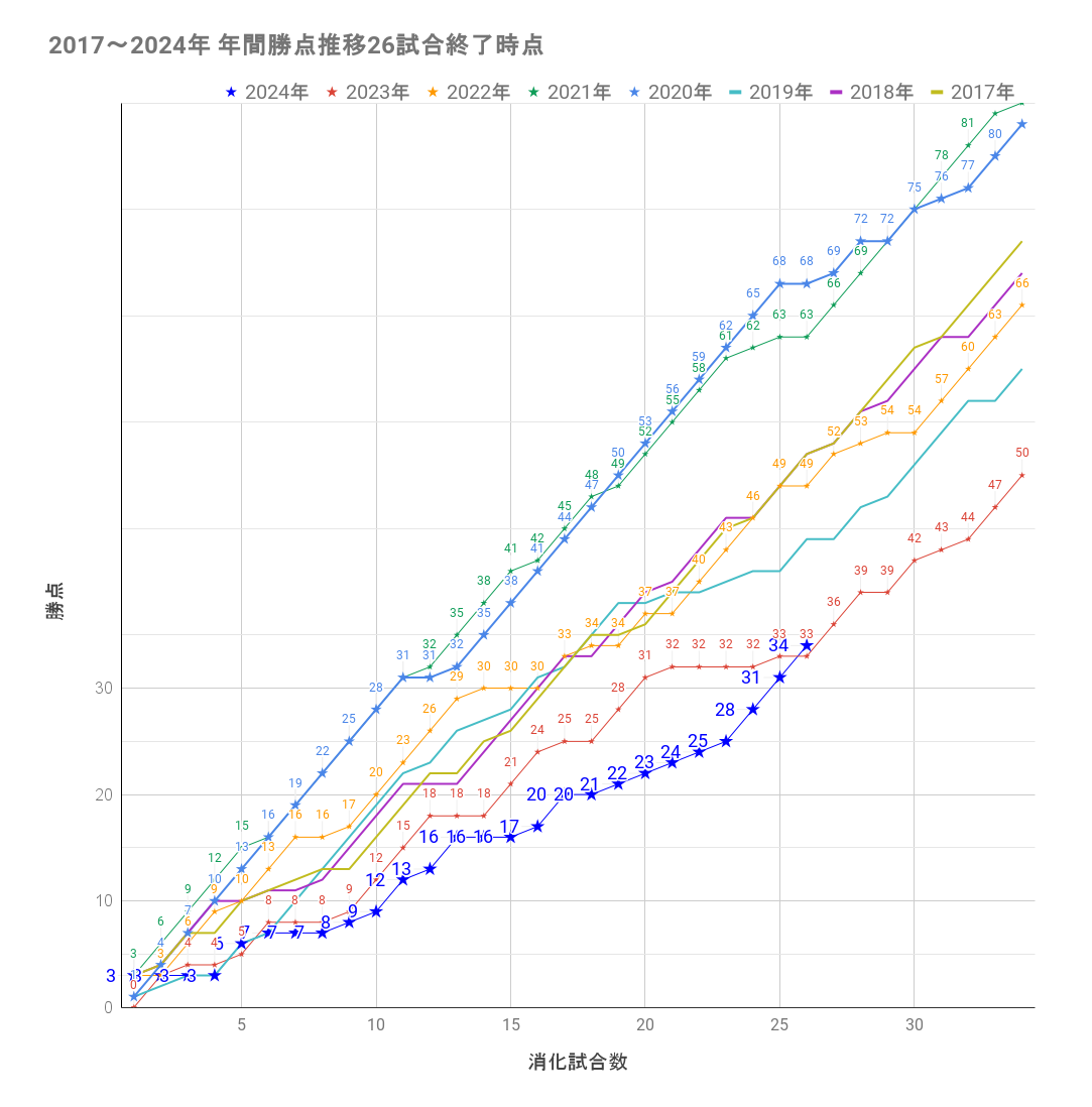 川崎フロンターレの2024年の勝ち点推移を鬼木達監督体制過去、2017年〜2023年と比較したデータ。
